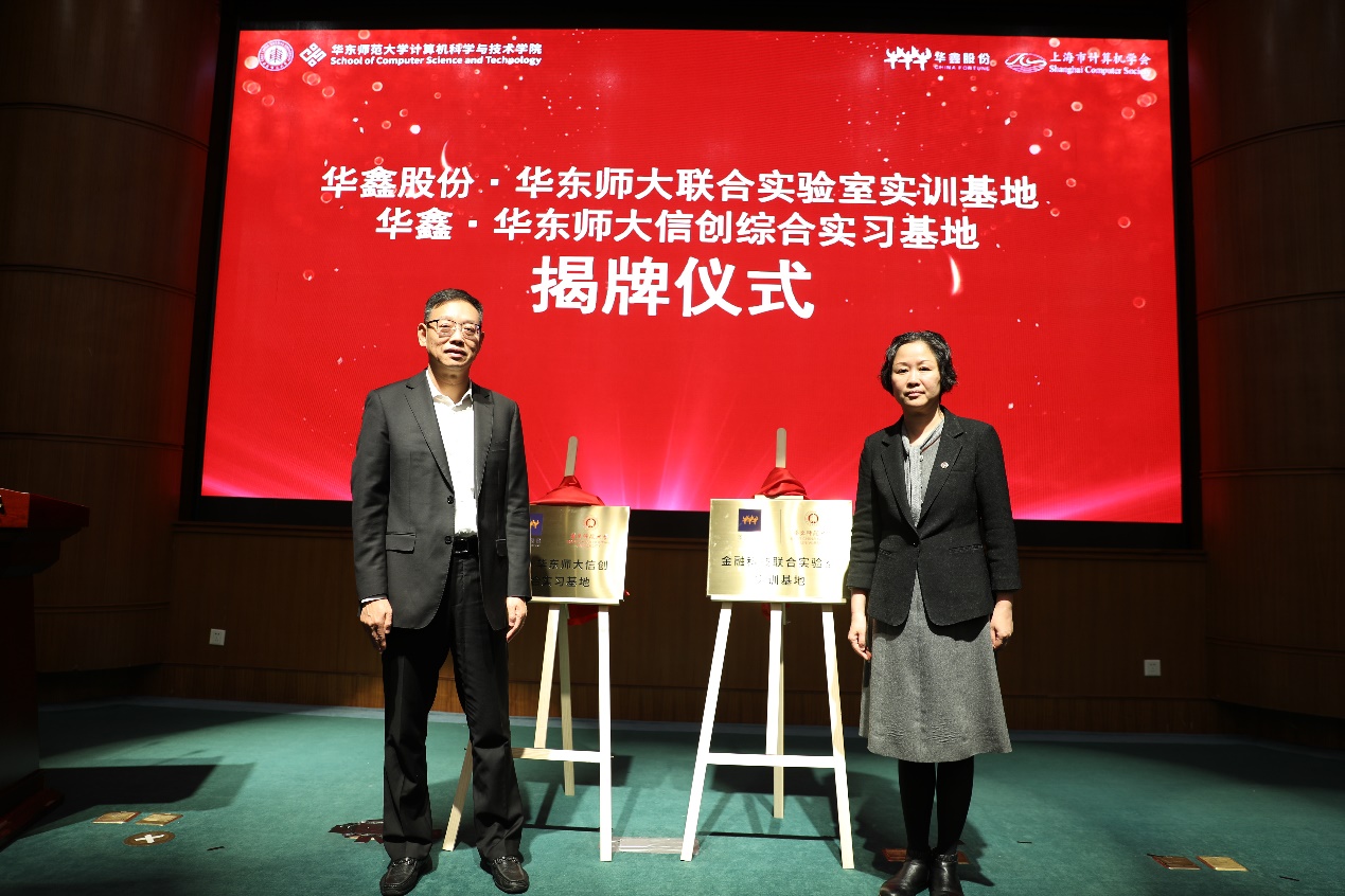 在热烈的掌声中,黄网 副校长程静与上海华鑫股份有限公司党委书记沈巍共同移步台前,为联合实验室实训基地与信创综合实习基地揭牌。仪式现场,大红绸缎缓缓飘落,崭新的牌匾在灯光下熠熠生辉,象征着黄网 与华鑫股份深度携手、协同共进。