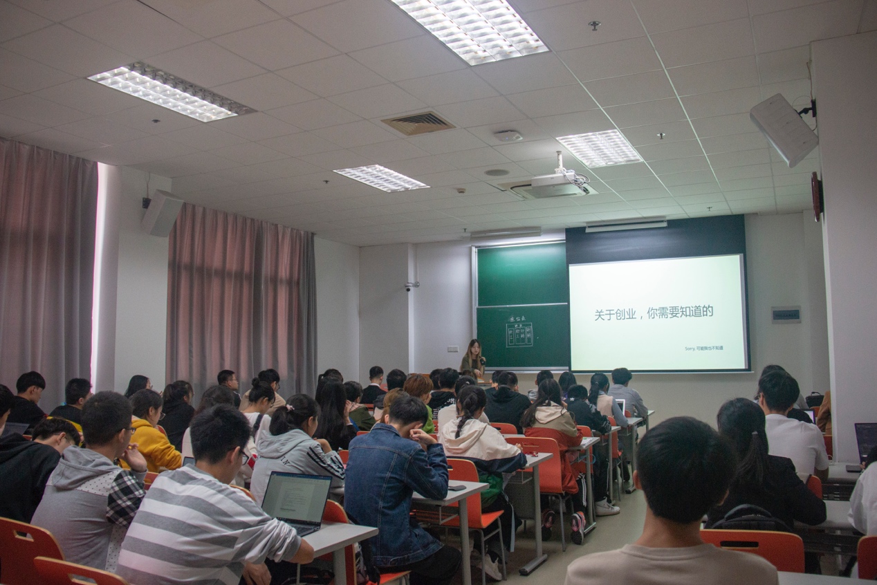 之后为大家带来分享的是与阮昕一同创业的金增辉。她告诉同学们了不少就业和创业“干货”:不要担心公司小,小公司有小公司的好处,比如工作调度更加灵活,自主权更大,同事间的关系也更为紧密;同时也能在一些不同的领域做尝试,积累经验,这可以培养在以后工作中解决各类问题的能力。最后,金学姐提醒大家:在大学期间要抓好学习,开阔视野,还要有健康的身体;同时始终对自己的事业抱有热情和信心,迎接挑战,不能服输。