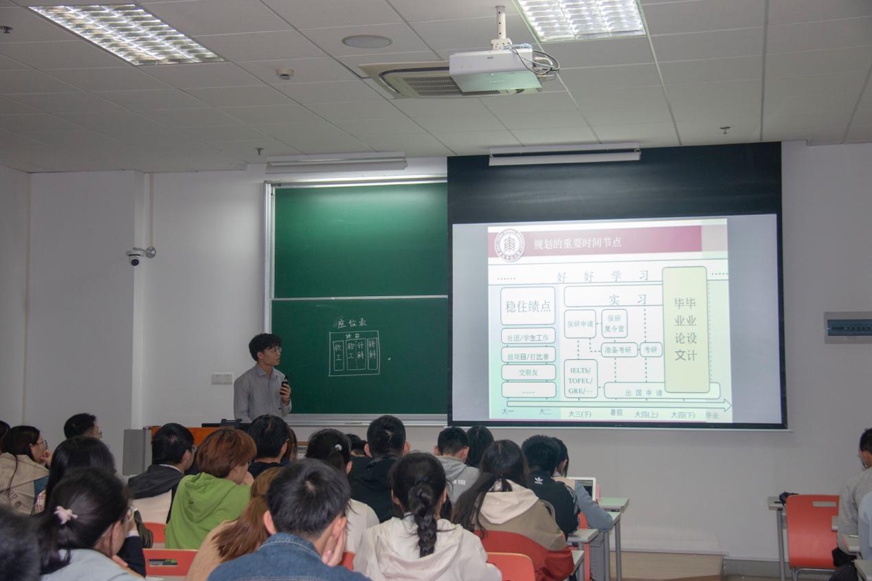 第三位嘉宾是硕士研究生汤景韬。学长以自己的经历为背景,对大学四年的规划提出几点建议:大一大二要稳住绩点,可以积极参与学生工作,根据自己的实力参加比赛;大三大四要花精力在毕业后的规划上:实习或是保研、考研、出国,提前做好准备。同时,学长也指出了英语能力、信息检索能力和自学能力的重要性,并向大家推荐了latex和markdown等一系列科研利器。最后,他强调,面对无解的问题,要有“死磕”的劲去努力寻找答案。