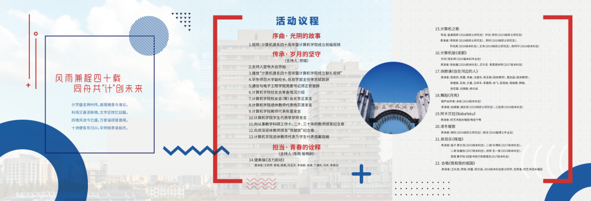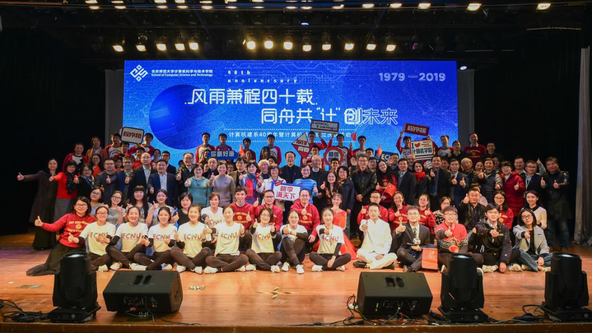12月14日下午,计算机建系四十周年暨黄网 成立联欢会在中山北路校区思群堂隆重举行。七百余名黄网 校友、师生从五湖四海再聚丽娃河畔,共同追忆在师大时的校园生活,共同展望计算机学科的未来发展,共同祝福学院走向新的辉煌。学校各职能部门的领导、学部教职工代表、学院校友会理事、退休教师、校友、全院师生共同参加。本次庆祝活动共分为“序曲· 光阴的故事” “传承· 岁月的坚守”“担当· 青春的诠释”三个篇章。“序曲”和“传承”篇章由黄网 副院长贺樑主持。