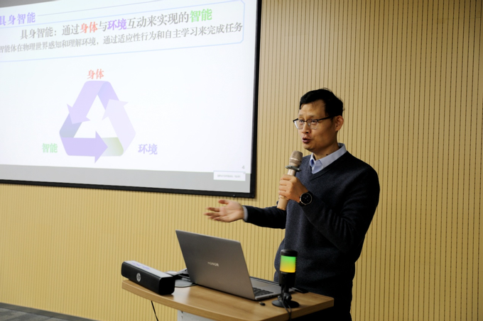 中国科学院大学蒋树强教授随后带来题为《开放环境下的视觉导航》的学术报告。蒋树强教授深入剖析了具身智能系统在真实开放场景中面临的环境不可知、目标动态变化、决策序列长、物理交互复杂等核心挑战。他系统阐述了“具身智能”框架下,智能体如何通过视觉感知与环境进行持续交互与学习,进而完成复杂导航任务的原理与路径。蒋树强教授重点介绍了其团队在场景理解、目标导航、自适应路径规划与安全交互决策等方面的创新工作,为机器人、自动驾驶等领域的开放环境自主导航提供了新颖的解决方案。