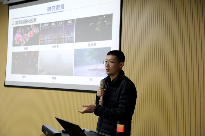 南京理工大学潘金山教授以《高效可控生成式复原方法》为题展开报告。潘金山教授系统剖析了图像与视频在采集、压缩、传输及显示链中,因分辨率不足、低光照、噪声干扰与动态范围有限等多重退化因素交织所导致的复原挑战,指出现有的基于判别式建模的复原方法面临细节丢失的问题,而基于生成式建模的复原方法面临可控性不足、计算效率低的问题。此外,潘金山教授还分享了团队对多部经典红色抗战影片的重点片段高清彩色修复应用案例,为媒体制作、视觉监控与移动成像等领域的质量增强提供了关键技术支撑。