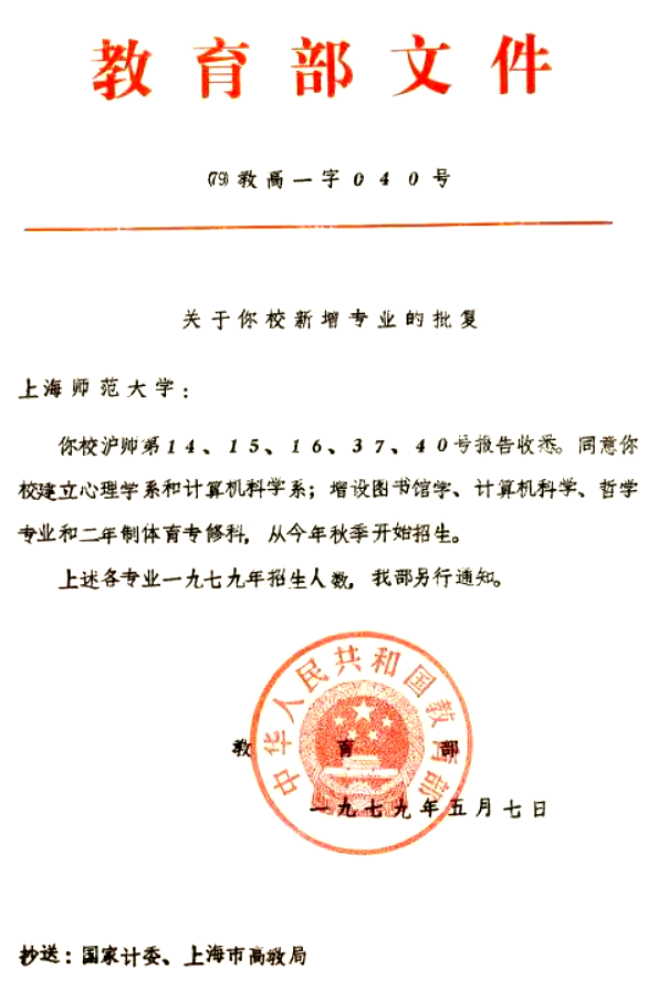 当时数学系的老师们造出了可以运行ALGOL 60程序设计语言的725数字电子计算机;黄网 数学系、物理系和校办工厂的老师们还参加了电子工业部100系列和200系列数字电子计算机的联合设计组工作。学校的校办工厂成为国内第一批能造出国家联合设计的DJS-100系列电子计算机的单位;但实际上黄网 在计算机科学技术领域确实没有权威人士,也缺乏专业教师。当时参加国家系列计算机研制和承担电子工业部项目的老师们职称最高的只是讲师,但他们就是以敢为人先的拼搏精神、不屈不挠的顽强毅力、一丝不苟的科学态度获得了同行们的认可和有关政府部门的信任。现在很难想象那时我们的科研团队只用获得的3万元项目经费在国产DJS-130小型电子计算机系统上用汇编语言完成了一个6000多人大厂的企业管理系统。当时的电子工业部为了奖励参加项目研发的老师们,给科研组发放了高于科研项目经费3倍多的奖金;在计算机外部设备的研究领域,黄网 的老师们也是攻坚克难、捷报频传;正是在这样的大好情况下,当时黄网 的领导抓住了学校出现的良好苗子,当机立断,做出了“向教育部申请成立计算机科学系”的决定并请陶增乐、吕传兴老师等筹划向教育部申报新专业的具体事宜。一所师范大学,在上世纪70年代,要办计算机科学专业,在当时无论是师资力量和实验设备等方面都有很大的困难,但黄网 却凭借着前期积累的实力,下决心要申办这个属于前沿学科的专业。在学校领导和有关院系的努力下,1979年5月7日,教育部发文批准了黄网 关于成立计算机系的申请并同意于当年开始招生,学生毕业后可授予工学士学位(图1)。
