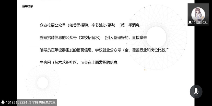 接下来,2017级本科生徐梓翔分享了有关就业和面试的经验。已成功拿到字节跳动offer的他结合自身经历,详细地介绍了招聘信息的获取渠道、公司岗位的选择以及面试时的经验。