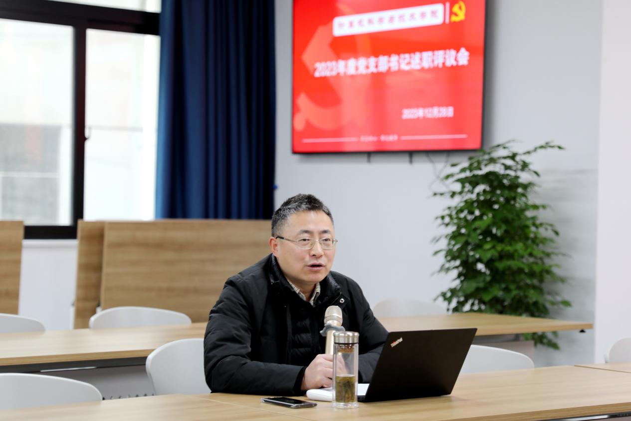 学院党委书记余佳首先做抓党建工作述职报告。他从“强化党组织理论学习,推动党员教育务实见效”、“完善党的组织体系和阵地建设,提升党员活动质量”、“党建工作与业务工作深度融合,引领学院事业高质量发展”、“按照‘五个到位’工作要求,认真履行抓基层党建工作第一责任人职责”四个方面总结了2023年抓党建工作主要成绩,然后从“学院的组织架构与党的组织体系建设还需要进一步完善”、“研究生党建的抓手不够,研究生导师立德树人职责还需要进一步激励”、“师资队伍整体状况与学院事业发展还有较大差距,青年人才队伍建设还需要花大力气”、“学院基础设施与教学实验环境亟待改善,资源供给与师生期待尚有差距”四个方面检讨了存在问题并分析原因,最后通报了2024年拟开展工作计划。