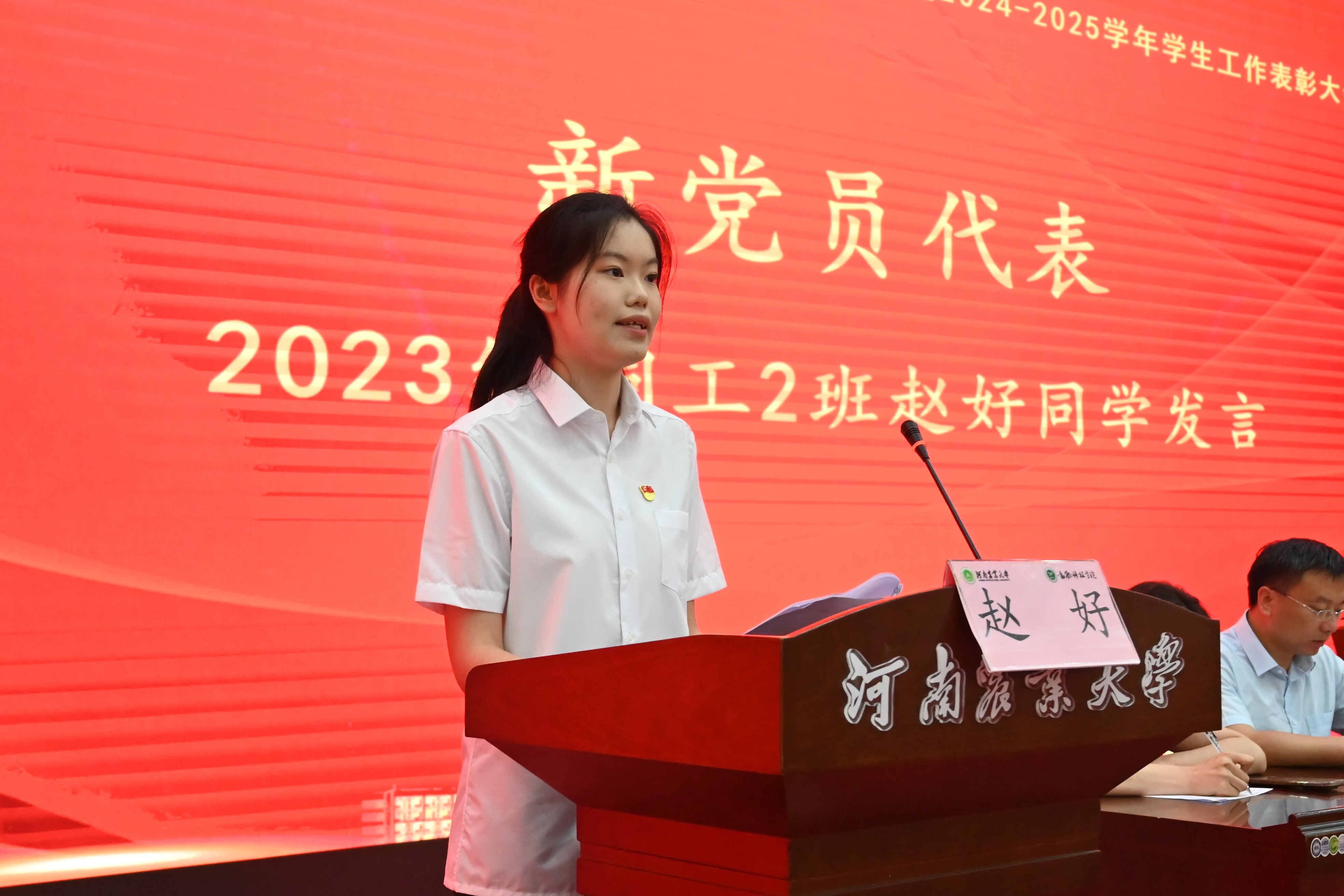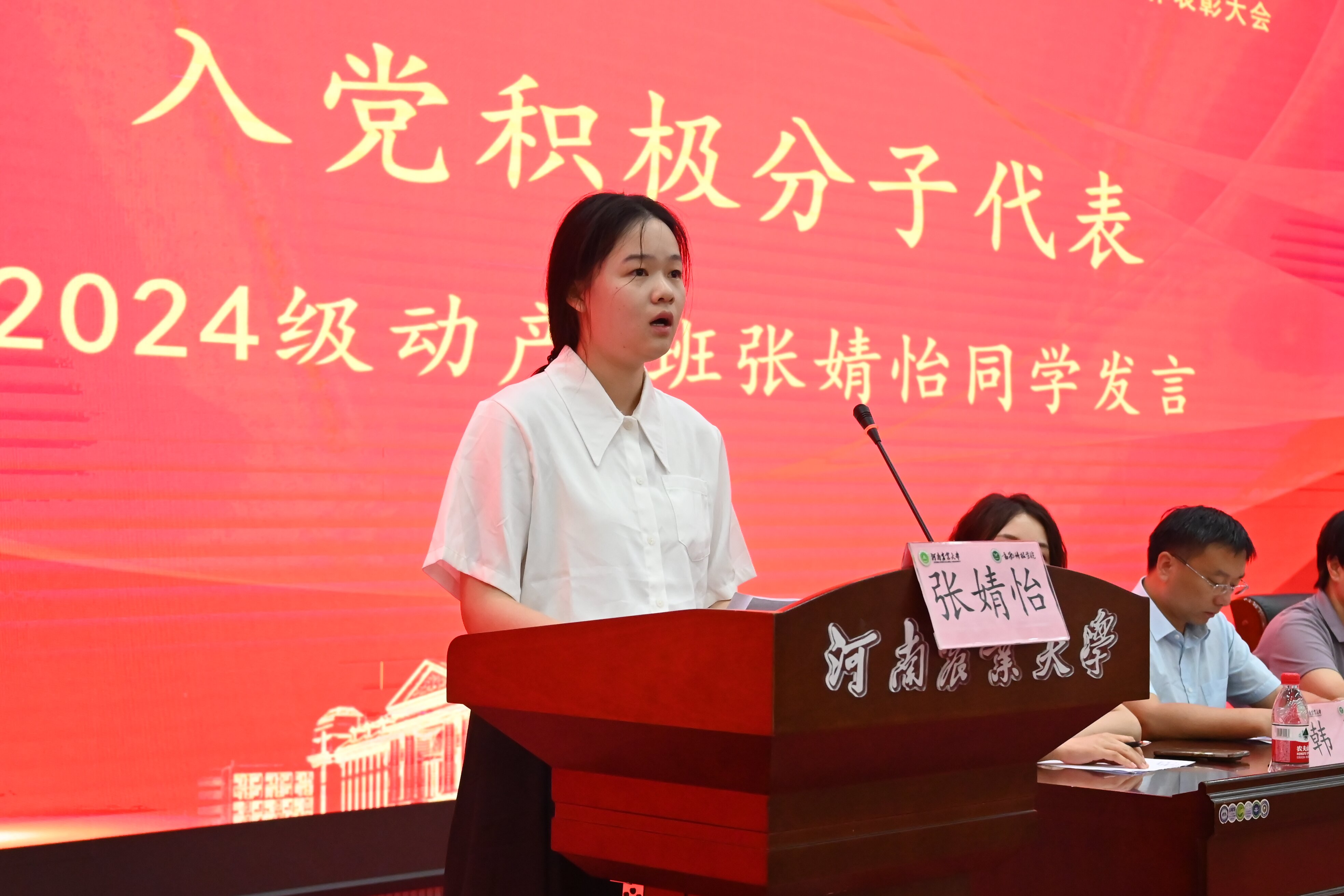 会议在庄严的《国际歌》中拉开帷幕,酒梅菊宣读新党员名单,韩笑带领新党员庄严宣誓。2023级饲工二班赵好同学作为新党员代表发言,表示自己将牢记党员的初心和使命、在探索求知上孜孜不倦、在履职尽责上真抓实干、在立德修身上持之以恒,以奋斗践行使命,以行动磨砺青春。2024级动产八班张婧怡作为入党积极分子代表发言,结合自身一年来的实践,号召全体入党积极分子,以丰富学识筑牢信仰根基,用实际行动展现责任意识,以全面成长践行初心使命,争取早日加入中国共产党。