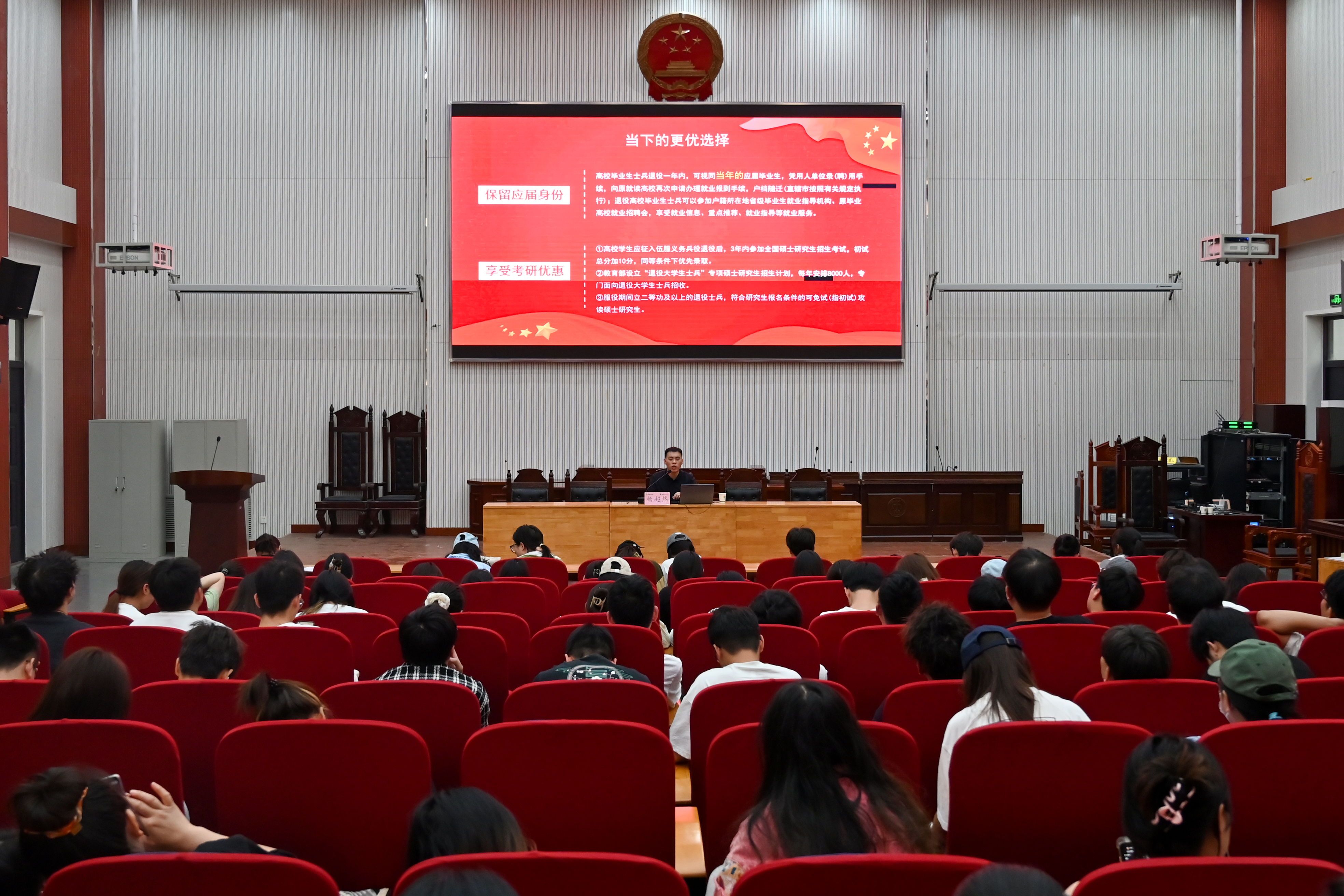 本网讯(通讯员 朱琳)为鼓励毕业生积极响应国家征兵号召,投身军营,建功立业,厚植家国情怀,5月8日下午,黄网于龙子湖校区繁塔楼大教室三模拟法庭召开2025届毕业生征兵政策宣讲暨国防主题教育活动,院党委副书记郭娟、副院长李转见、院组织员兼团委书记韩笑,辅导员赵姝灿、杨超然及2025届全体毕业生参会。