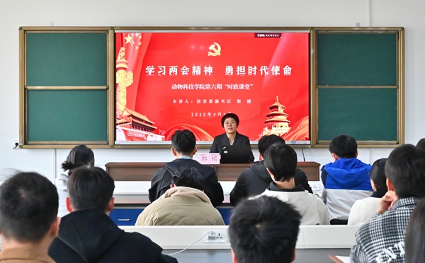 郭娟从“探秘两会,走进国家政治核心领域”“洞察2025两会核心议题,把握国家发展脉搏”“聚焦两会与高校发展,开启教育新征程”“勇担时代使命,奏响动科强音”四个方面,向大家解读了全国两会精神。她指出两会强调的科技创新、教育优先和人才强国战略与高校发展紧密相连,“深入实施科教兴国战略”的部署为高等教育发展提供指引,黄网将从提升学科建设质量、深化科教融汇工作、加强有组织科研等方面开展学生工作,促进教育教学和人才培养。最后,郭娟鼓励学生党员积极参加科研项目,投身于实践活动与志愿服务,提升自身综合实力,为成为高素质复合型畜牧人才不懈奋斗。