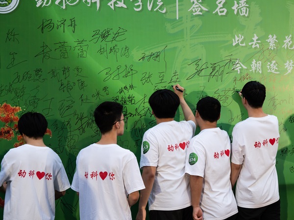 文化和时光印记;签名墙上毕业生浓墨留下对母校最深的眷恋与感恩,文化衫涂鸦区,衬衫上的涂鸦刻下了与动科的特殊羁绊,情寄明信片用最柔软的笔触写下最真诚的祝福;游戏互动区,单眼弹瓶盖等趣味十足,现场互动抽奖环节,共送出豪华行李箱、高档双肩包等礼品50份,助力毕业生逐梦前行;美食区酸奶饮料零食大荟萃,打造一场味蕾盛宴,共襄毕业美好‘食’刻,让欢笑与美味成为难忘的记忆篇章。“仪式感太足了,很骄傲”毕业生蔡钊激动地表示。