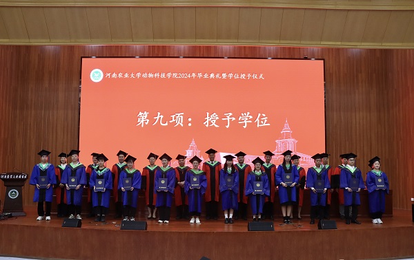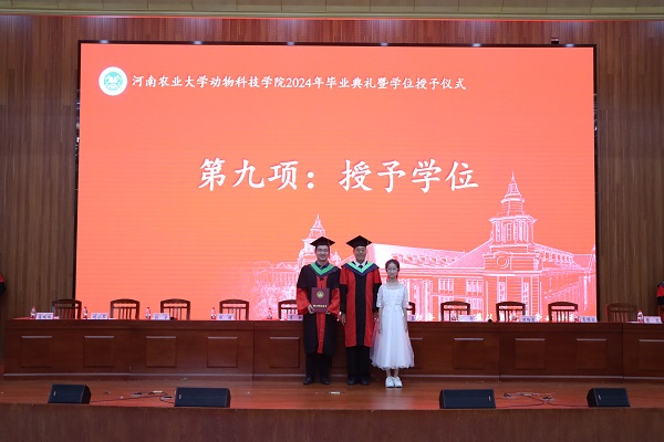 在庄严的国歌声中,毕业典礼正式拉开帷幕。副院长酒梅菊宣读《2024届优秀毕业生名单》、副院长孙宇宣读《2024届博士和硕士学位授予决定》、农大牧原联合产业研究院执行院长兼黄网