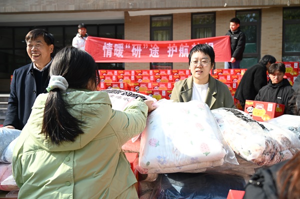 将全力为大家保驾护航。他对大家努力备考的状态表示欣慰,提醒学生要做到系统地复习考研知识,及时查漏补缺,最后祝愿大家成功上岸,心想事成。随后由领导老师亲自为每位考研学生发放精心准备的面包、毛毯等暖心物资,并鼓励大家要全力以赴、奋战到底,师生亲切交谈,友好互动。活动现场气氛热烈,学生们深刻地感受到黄网