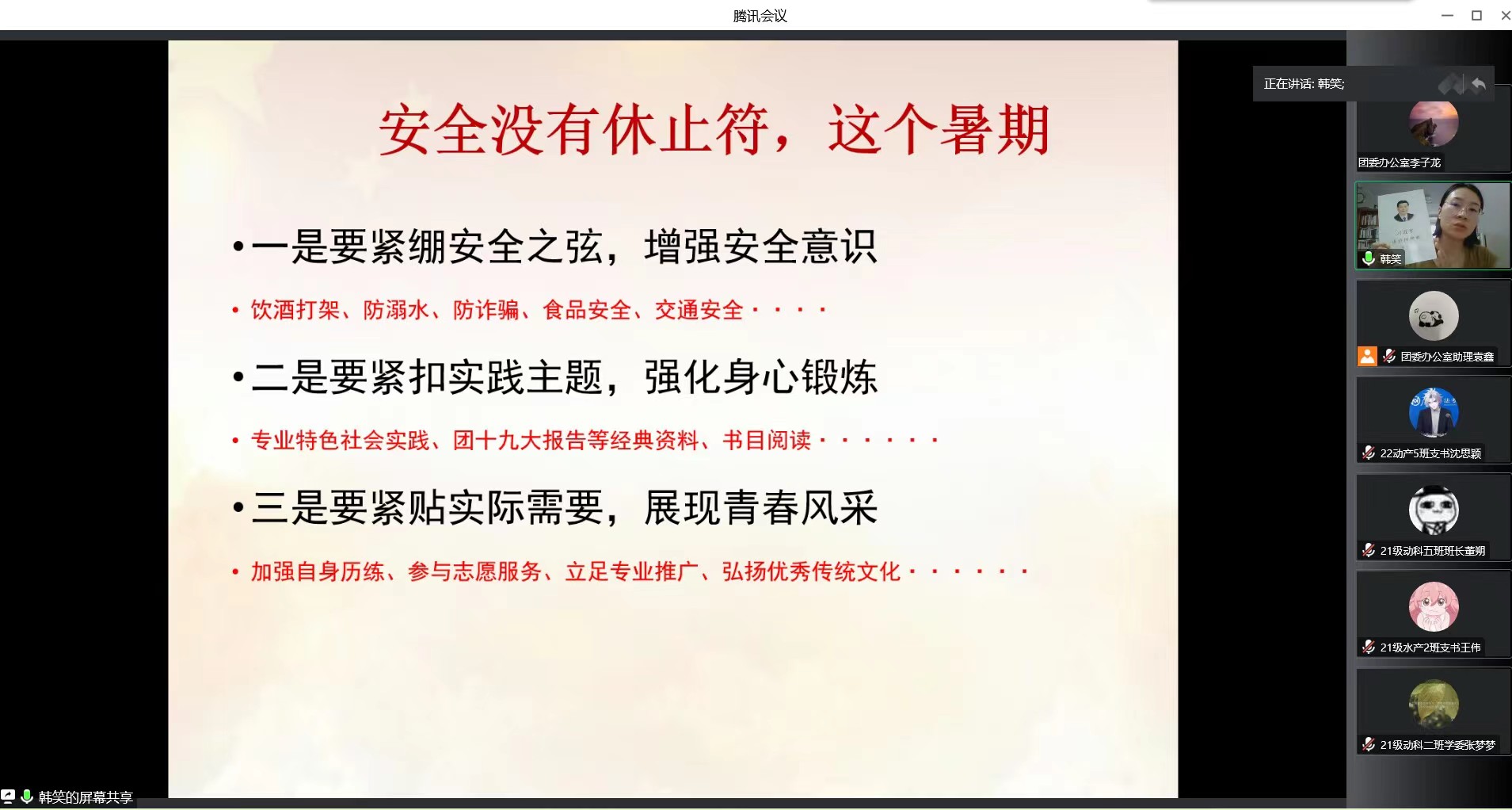 通过线上会议的形式举行2023年暑期安全稳定会议,全体班委参会,会议由组织员兼团委书记韩笑主持。