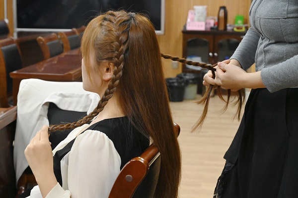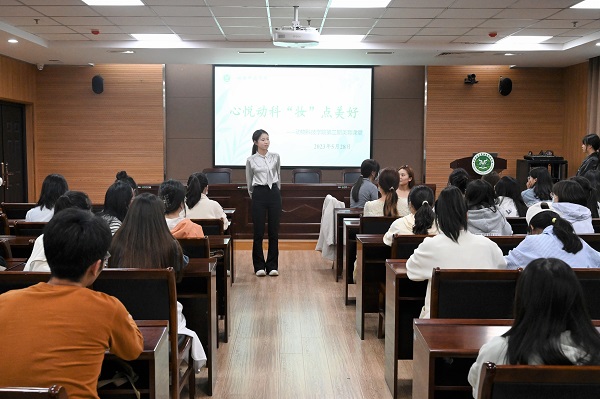 化妆师根据学生模特的脸型进行针对性讲述,提醒同学们应根据脸型选择合适妆容。随后,她从修眉、打底等基础开始,讲述了完整的化妆过程介绍,在遇到易错步骤时,着重强调注意事项,分享正确的化妆手法。学生兴致高涨,现场氛围热烈。老师还根据模特妆容及整体形象进行了简单的编发教学。学生们纷纷表示干货满满,要在日常生活中身体力行地提高自己的审美,做品味雅致的动科人。