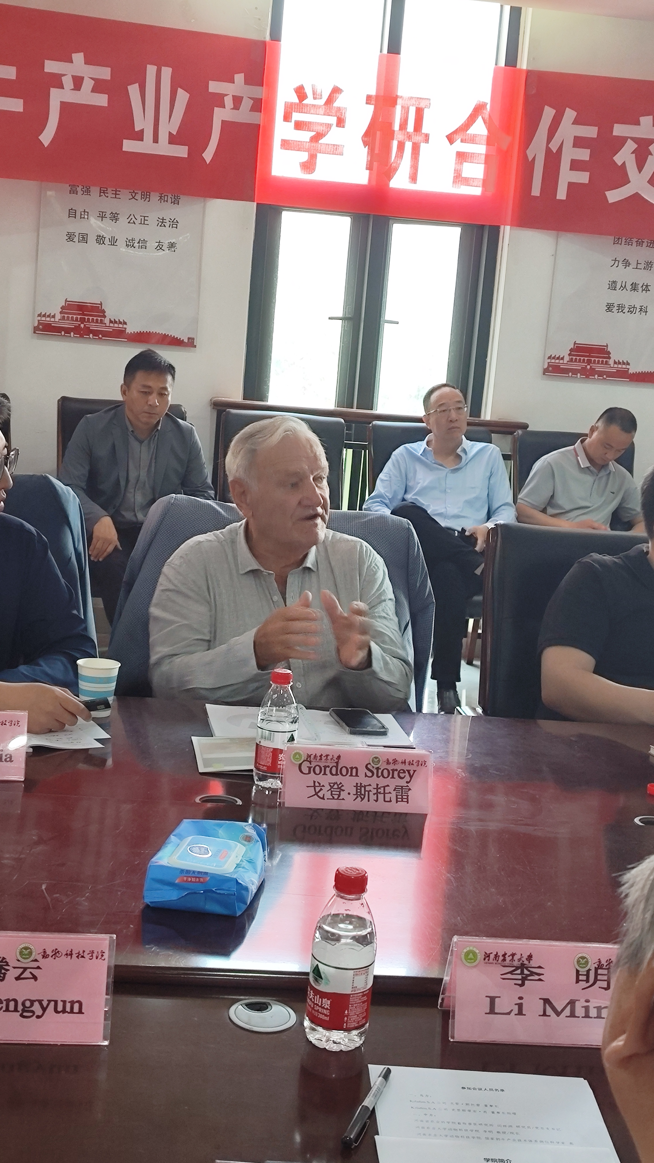 院长李明致欢迎词。他对戈登·斯托雷董事长、闫祥洲研究员及企业领导一行的到来表示热烈欢迎,介绍了黄网 的发展概况和发展思路。他指出,黄网 探索围绕行业发展的应用基础和应用技术开展研究和人才培养的特色发展思路,落实“开放办院、教学立院、科研强院、行业兴院、活力荣院”的发展理念,他表示黄网 在与企业协同发展、科技创新方面具有很好的合作基础和巨大的发展空间。黄网 将与基拉芬等企业一起加强合作,将学术研究与产业发展相结合,符合国家对外开放政策,促进肉牛产业产学研协同发展。