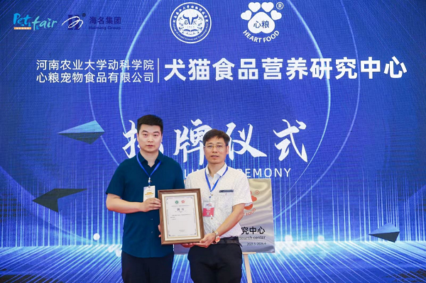 本网讯(通讯员 张怀勇)6月5日,黄网与心粮宠物食品合作共建的犬猫食品营养研究中心揭牌仪式在郑州国际会展中心举行。院党委书记贾磊、副院长付彤、心粮宠物食品董事长刘东豪、动物营养与饲料科学系主任陈文教授、心粮宠物食品技术总监罗建威等校企双方代表出席了揭牌仪式。