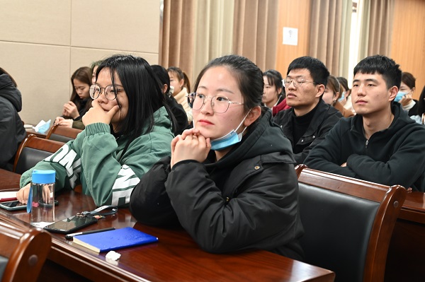 考研基本情况,讲解了研究生招生录取、调剂的政策及研究生复试的注意事项等方面的内容。付彤就本科生论文撰写、毕业重修和论文答辩等教学方面的工作进行了安排和指导。郭娟从就业方向的选择、就业心态的调整、就业政策、就业协议书签订、就业手续办理等方面进行了详细解读。