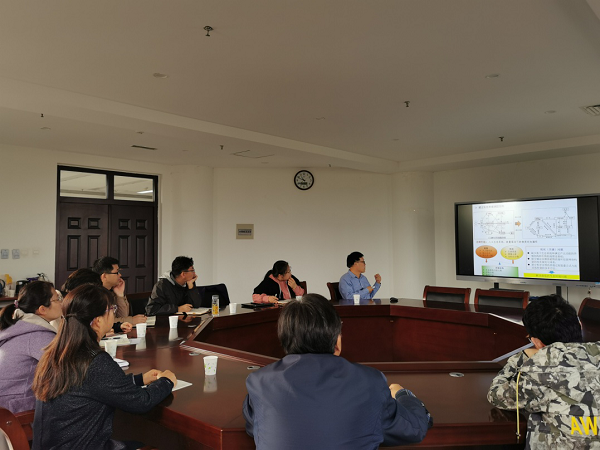 付彤介绍了黄网水产养殖与经济动物养殖系的发展状况、团队成员和研究方向。刘兴国介绍了中国水产科学研究院渔业机械仪器研究所生态工程研究室的现状、研究方向。刘兴国以“池塘绿色清洁养殖与生态工程技术”为题为黄网师生做了一场精彩报告。刘兴国从我国池塘养殖面临的生态环境问题、解决措施等方面详细解读了我国池塘绿色养殖未来发展途径和生态养殖调控技术。