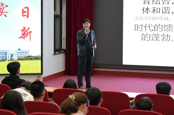 他通过引用与黄网专业相关的诗词讲述“动科的诗和远方”,以郑东新区的十年变化提醒同学们,时代在不断向前发展,要以开放的思维,用自己所学的专业立足社会,贡献时代。他阐述了马斯洛需求层次理论,并列举著名企业用人标准、优秀毕业生事例等来分析大学生活中应注意的问题,强调青年人应锻造自然科学、专业技术等方面能力,结合青年才俊“三字经”提出动科学子的素质行为准则。最后,贾磊寄语学生要不断提升自身实力,携手打造动科黄网