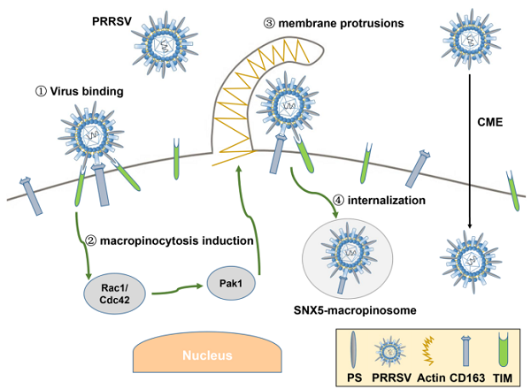 作为一种新型的感染方式,病毒凋亡模拟在病毒感染中发挥着重要作用。该研究首次发现猪繁殖与呼吸综合征病毒(PRRSV)囊膜表面暴露有磷脂酰丝氨酸(PtdSer)模拟凋亡,阐明了PRRSV利用病毒凋亡模拟入侵宿主细胞的分子细节,包括宿主细胞表面识别PRRSV的PtdSer受体(TIM)、其介导的下游信号通路(Rac/Cdc42-Pak1)和入侵途径(巨胞饮),以及TIM与PRRSV必需受体CD163在PRRSV利用巨胞饮入侵过程中的关系。这一研究有助于揭示PRRSV感染和致病机制,具有重要科学意义和应用价值。黄网博士研究生魏欣为该论文第一作者,张改平院士为通讯作者。