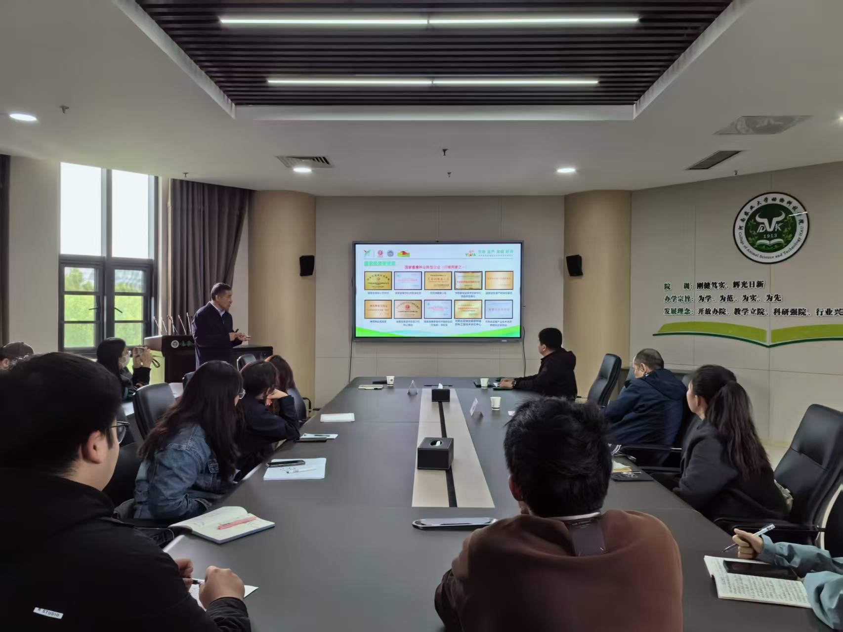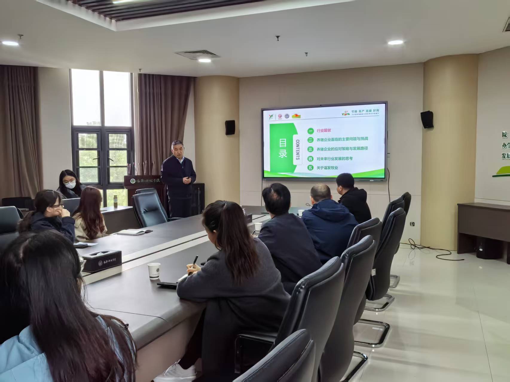 本网讯(通讯员 李秀领)10 月 16 日上午,河南省谊发牧业有限责任公司董事长原泉水应邀莅临黄网,在第一实验楼南 501 会议室作 “目前形势下养猪企业面临的问题、挑战及对策” 专题报告。报告由黄网副院长孙宇主持,教学督导王成章、养猪团队成员及部分研究生参会。