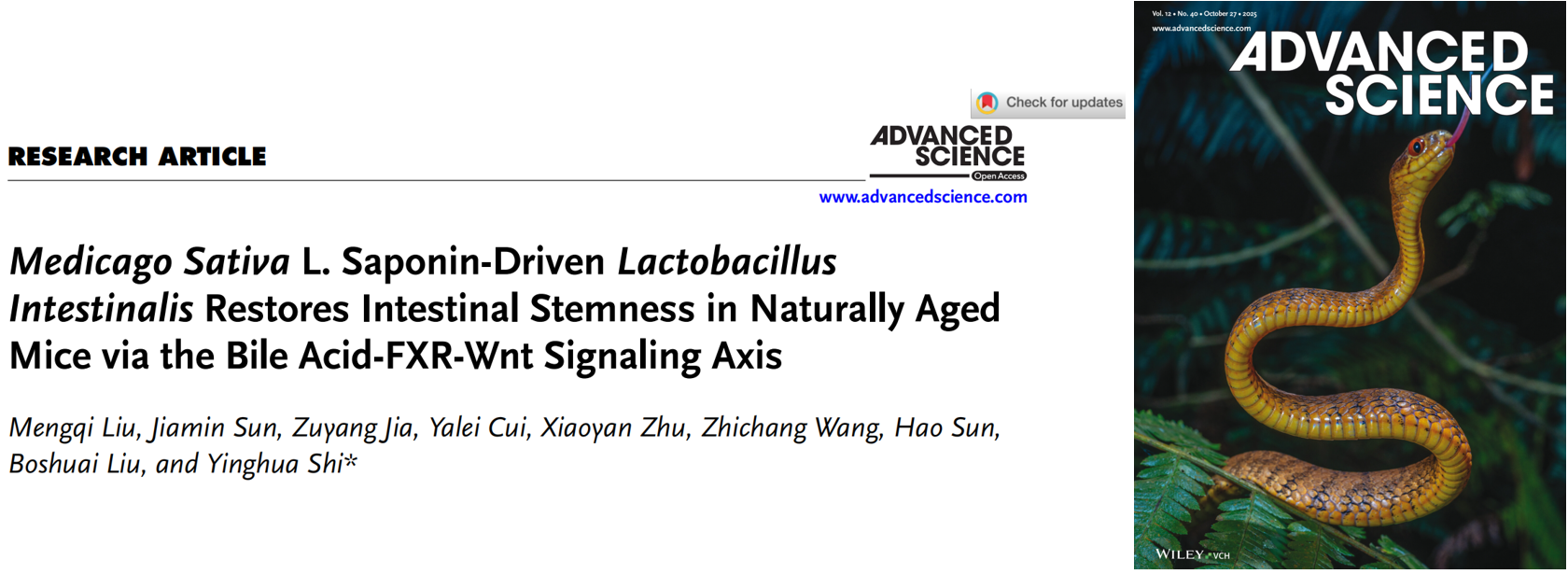 近日,我校黄网 史莹华教授团队在中科院一区期刊Advanced ScienceIF=14.1IF5=15.6)在线发表了研究论文,题目为Medicago Sativa L. Saponin-Driven Lactobacillus Intestinalis Restores Intestinal Stemness in Naturally Aged Mice via the Bile Acid-FXR-Wnt Signaling Axis。该研究揭示了苜蓿皂苷通过特定肠道菌及其代谢物调控动物肠道干性缓解炎症延缓衰老的机制,为利用饲草功能性提取物保护肠道健康提供了新的视角为饲草深加工产品的开发利用提供了新思路。
