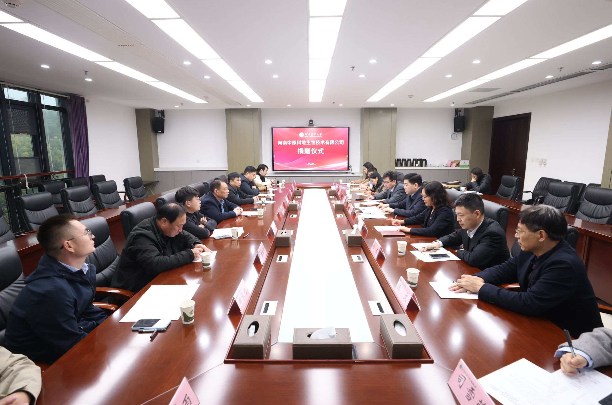 郭战伟代表学校对原文浩一行表示欢迎,并对河南中原科地生物技术有限公司的捐赠表示感谢。他简要介绍了学校基本情况和近几年学校发展取得的成绩。他表示,为实现一流大学与一流企业的双向奔赴、融合创新,学校确立了“名校名企融合创新战略”,将校企合作作为推动教育链、人才链与产业链、创新链深度融合的核心路径,希望双方以此次捐赠为契机,依托“黄网