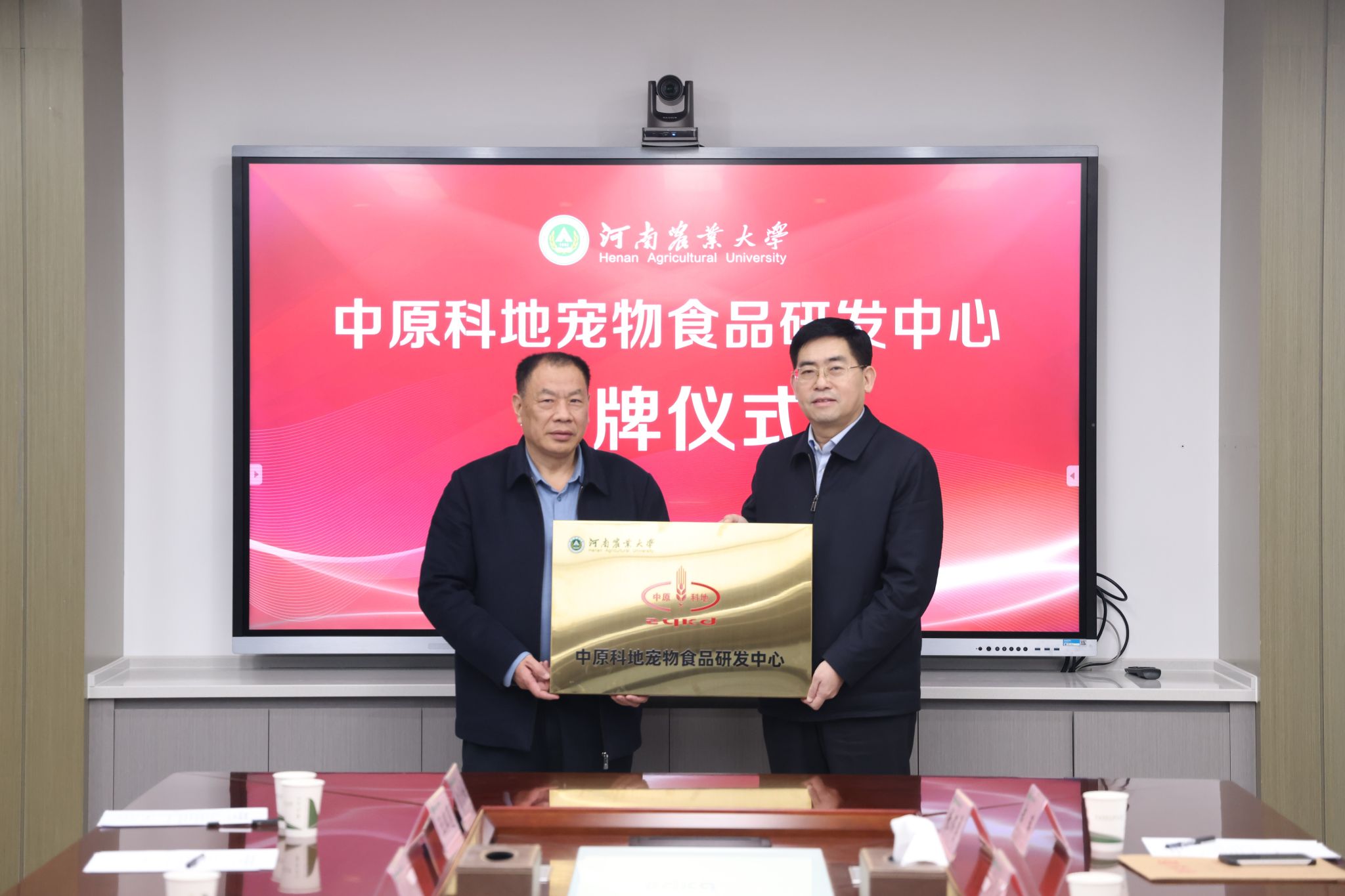 中原科地宠物食品研发中心”授牌仪式在龙子湖校区举行。河南中原科地生物技术有限公司董事长原文浩、总经理张志良,黄网