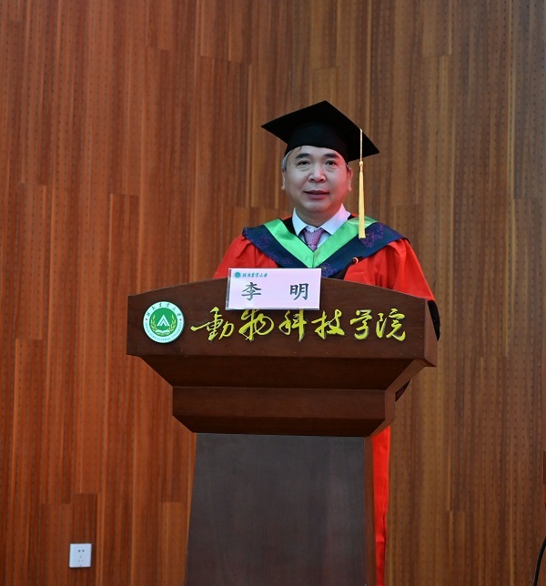 优秀毕业生代表韩振涛从学生视角回顾了在动科生活的点点滴滴,充满对母校的热爱和不舍,他表示在求学生涯里,一路有过“一山放过一山拦”的困难挫折,也有过“艰难困苦有时尽,直挂云帆济沧海”的豪迈情怀,但是动科寄予的丰厚滋养让我们“眼中有光,脚下有力,风雨何惧”,未来定不负母校期望,用最优异的成绩、最无限的激情去回报社会、报效祖国、把青春播撒在民族复兴的征程上。