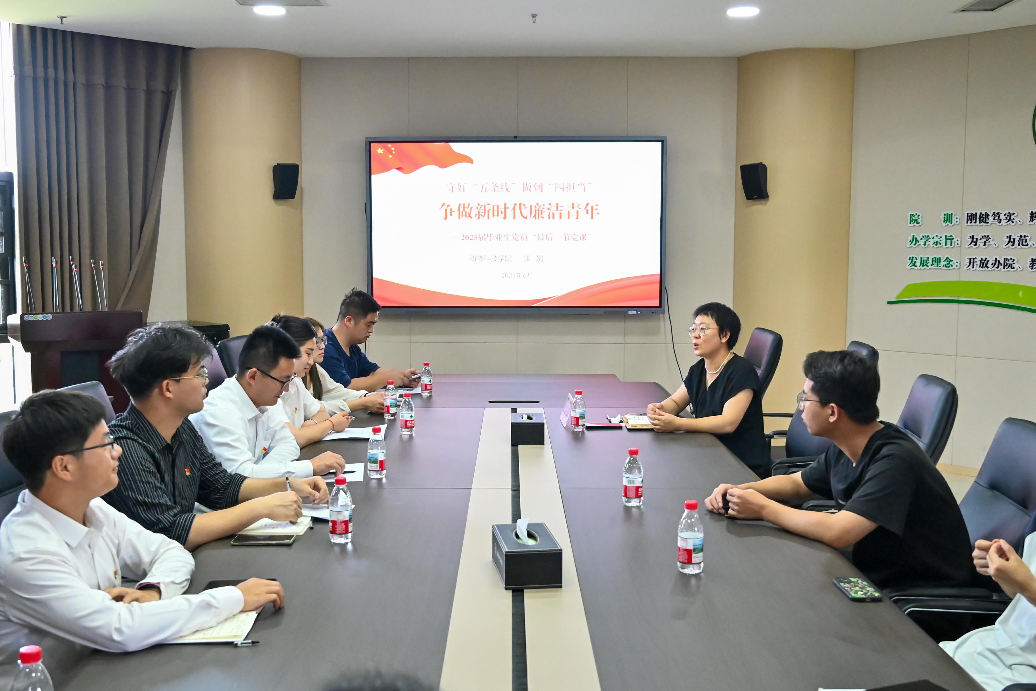 郭娟以《守好“五底线” 做到“四担当”,争做新时代廉洁青年》为题,从“充分认清形势 保持清醒头脑”、“坚决守住底线 做到廉洁自律”、“敢于担当作为 推动工作落实”三个方面勉励毕业生党员要强化政治担当、责任担当、使命担当、实干担当,在人生新阶段上主动作为、攻坚克难。始终牢记党员身份,发挥先锋模范作用,以廉洁自律的品格和担当实干的精神,书写无愧于时代、无愧于人民的青春答卷。