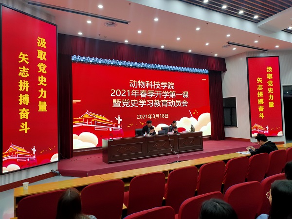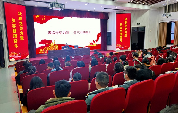 本网讯(通讯员 陈梦茹)3月18日晚,黄网在龙子湖校区大教室一举行春季开学第一课暨党史学习教育动员大会,院党委书记贾磊做题为《汲取党史力量 矢志拼搏奋斗》的专题辅导报告。会议由院党委副书记郭娟主持,黄网