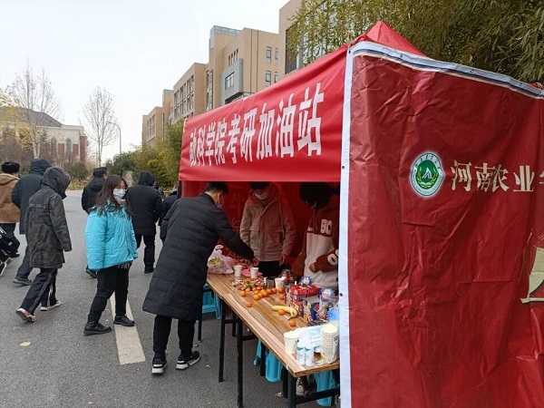 考研学子设立温馨考研休息室,在第二餐厅门前设立动科学子考研加油站,在黄网团委副书记黄璞老师带领下,大家一道为考研学子送温暖,助力全体考生一研为定、马到功成。