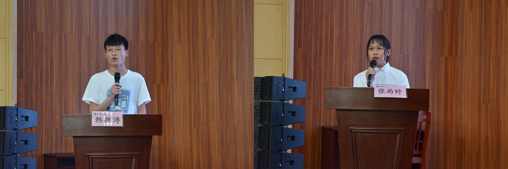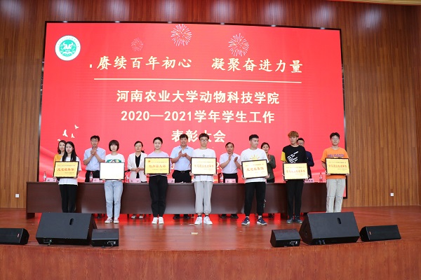 在欢快的乐曲中,与会领导为获奖集体及个人依次颁奖并合影留念,先进集体代表、2018级动物科学2班班长韩振涛和先进个人代表、校级三好学生、2018级动物科学4班张雨时同学作交流发言。