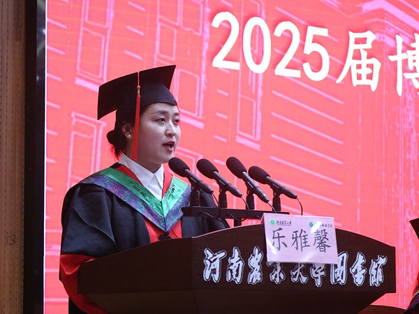 研究生毕业生代表、2025届博士研究生乐雅馨发言。她回顾了从本科到博士11年间,成长为具有国际视野的农业科技工作者的过程中,扎根动科共奋进的青春记忆。并寄语学弟学妹们要珍惜校园、多去图书馆和实验室,要正视犯错,每一次失败都是成长的养分,要常怀感恩之心,用每一次进步回报师恩。她号召大家牢记“农大动科人”的身份,务实奋进,为强农弘农贡献动科力量。