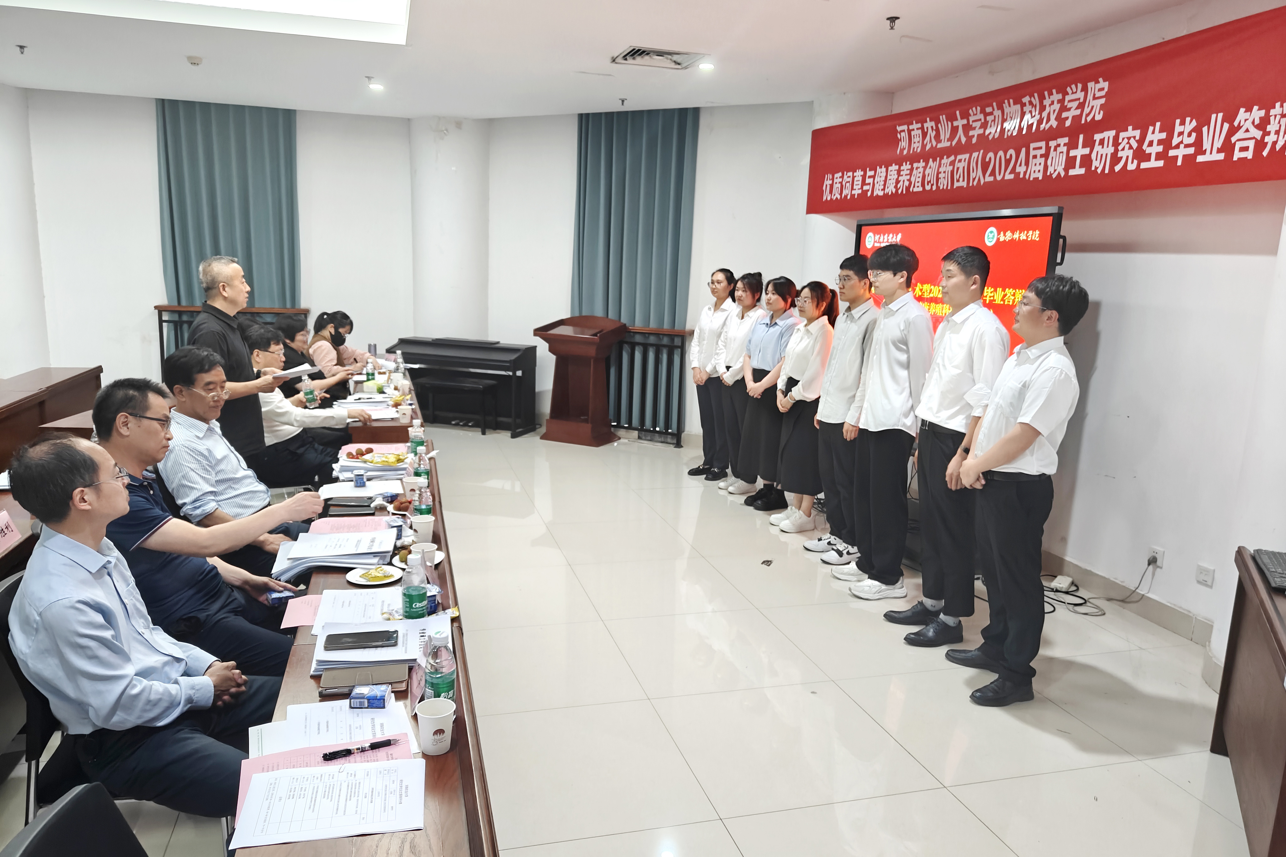 研究生论文答辩的要求和程序进行,依次完成导师介绍答辩人个人情况、答辩人汇报PPT、专家提问等环节。优质饲草与健康养殖创新团队的8位2024届硕士研究生,分别从选题背景、研究方法、研究内容、研究结果、创新点及未来展望等方面向答辩专家汇报了硕士期间的科研工作。答辩专家们针对论文选题依据、研究成果、专业能力、写作能力和答辩水平等方面进行了深入的提问,全面考察了毕业生的专业知识掌握程度及综合素养,并提出了宝贵的意见和建议,以进一步提升研究生论文的质量。答辩同学认真记录并回答了专家学者提出的问题,表示将对论文进行进一步修改和完善。答辩现场气氛严肃而融洽、紧张而有序。