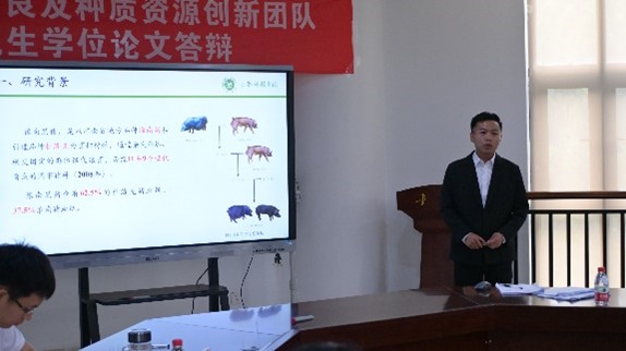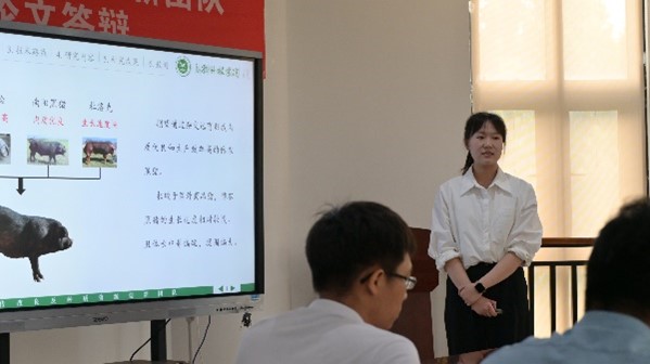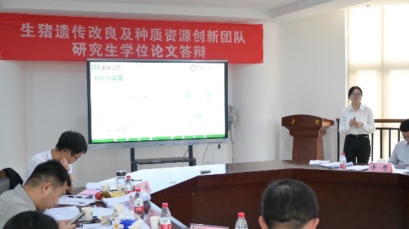 研究生论文答辩的要求和程序,秉承公开透明、严谨公正的原则,从导师介绍答辩研究生个人情况、答辩学生汇报PPT、专家提问、学生回答等环节开展答辩工作。生猪遗传改良及种质资源创新团队10位硕士分别从选题背景、研究方法、研究内容、研究结果、创新点及未来展望等方面向答辩专家汇报了硕士期间的科研工作。在评委点评提问环节,答辩委员们对同学们严谨的态度和论文的学术水平给予了充分肯定,对论文中存在的逻辑结构、语言表达、格式规范等问题提出了进一步修改的意见和建议,并针对每位答辩研究生的论文疑惑进行提问。每位学生都认真回答了评审提出的问题,并表示答辩之后将再次修改完善论文。答辩现场气氛严肃而融洽、紧张而有序。