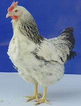 N系:雏鸡公、母鸡均为慢羽,黄胫、灰白羽,背、颈、翅带黑斑;成年公母鸡均为正常型,黄胫、少量白胫,浅芦花羽(哥伦比亚羽色),单冠、黄白皮肤,蛋壳颜色为褐色。