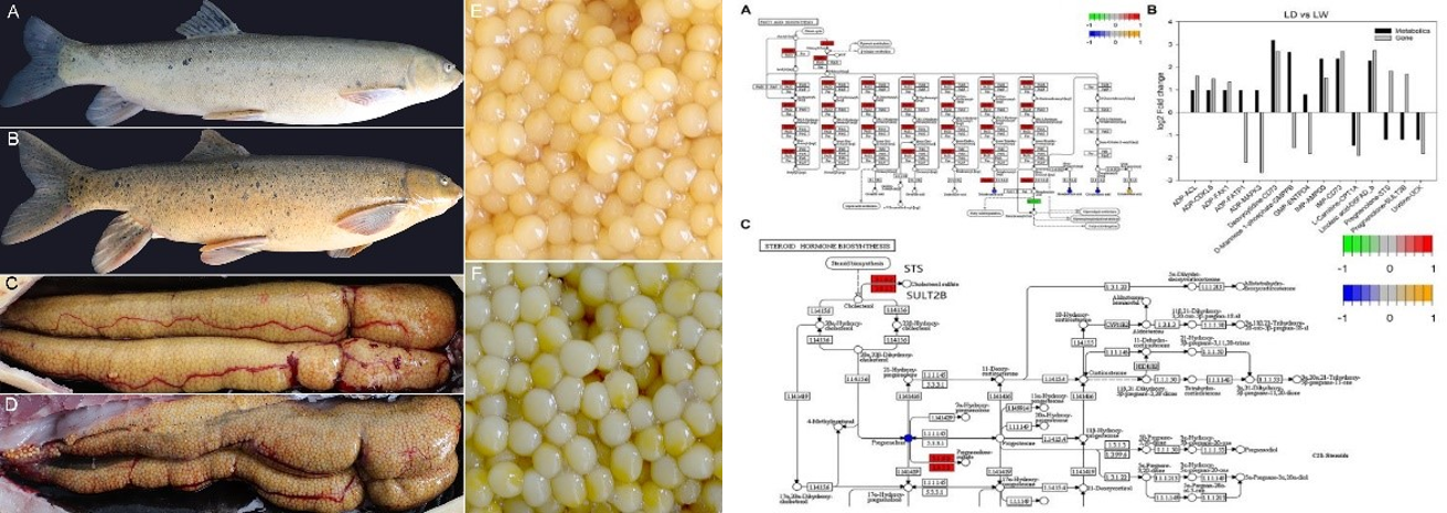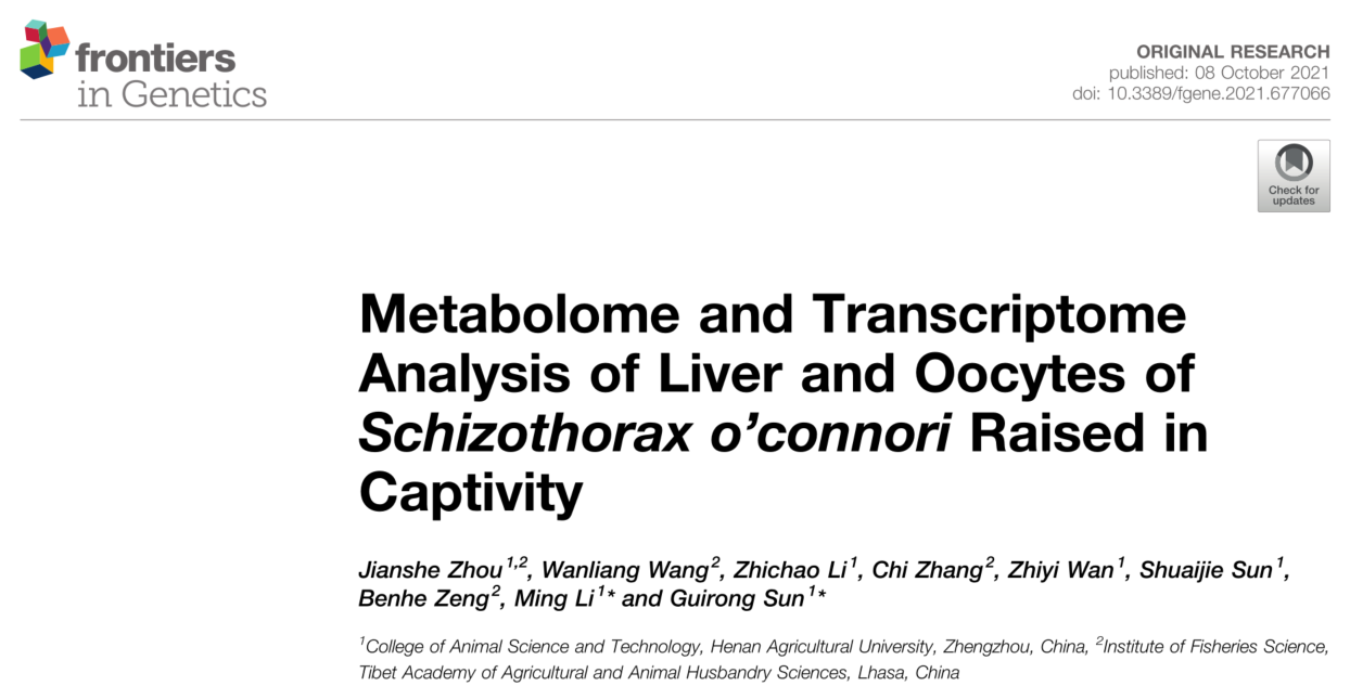 水产科学研究所合作,探究了人工驯养条件下异齿裂腹鱼卵母细胞和肝脏在形态、代谢物和基因表达的变化,发现与卵巢发育相关的代谢物孕烯醇酮和花生四烯酸存在明显差异。代谢组学和转录组学数据的比较表明,肝脏中不饱和脂肪酸的生物合成、淀粉和蔗糖的代谢和脂肪酸的生物合成3个代谢通路差异显著。10月8日,该研究成果在期刊Frontiers in genetics(IF=4.599),以Article形式在线发表。