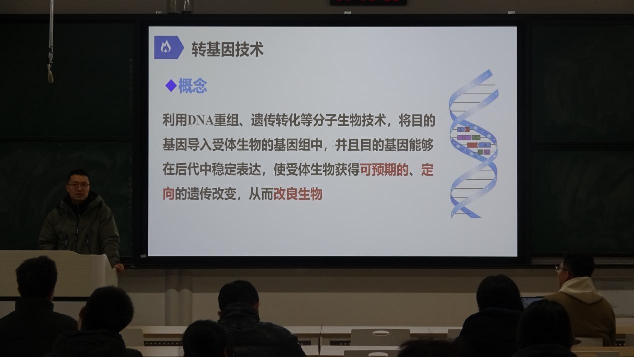 刘志国副研究员以《动物转基因技术及基因编辑技术》为题。首先,他介绍了八种转基因动物的制作方法,例如显微注射法、精子载体法、胚胎干细胞介导法等以及基因组编辑时代的转基因技术,通过比较ZFN、TALEN、CRISPR/Cas9技术的优缺点,为同学们阐述了世界大家畜基因编辑的发展历程。随后,刘志国副研究员又为同学们介绍了转基因技术在生产实践中的应用,环保猪、抗乳房炎转基因奶牛、人类永久性新生儿糖尿病犬引起了同学们浓厚的兴趣,并且指出异种移植是解决供体短缺的有效途径也将会引起下一次医学革命。最后,他又为同学们讲解了基因编辑技术Knock-in(敲入)和Knock-out(敲除)的案例,例如在持家基因GAPDH终止密码子附近定点插入外源基因表达框、利用插入序列实现knockout。