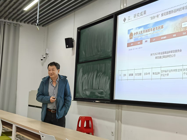 报告中,徐安凯研究员详细介绍了其团队在紫花苜蓿三系育种方面取得的重要突破。他们首次创立了紫花苜蓿雄性不育三系配套体系,培育出不育率达98%以上的不育系,并对其雄性不育机理进行了初步探讨,获得4个相关分子标记。在此基础上,他们创制和培育了一批新材料和新品系,组配杂交组合539个,培育杂交新品系6个,其中"吉杂1号"已成功进入国家草品种审定区试网。该成果整体达到国际先进水平,为转育更多的不育系和保持系材料奠定了基础,使紫花苜蓿杂交育种工作更加便捷高效。紫花苜蓿杂交种的育成有望显著提高其产量、品质和抗逆性,对我国畜牧业发展具有重要意义。该研究成果达到国际先进水平,为后续培育更多不育系和保持系种质材料奠定了坚实基础,显著提升了紫花苜蓿杂交育种的效率。紫花苜蓿杂交品种的培育有望大幅提高其产量、品质和抗逆性,对推动我国畜牧业可持续发展具有重要的战略意义。报告结束后,徐安凯研究员与在场师生就苜蓿育种技术、发展前景等问题进行了深入交流。与会师生纷纷表示获益良多。