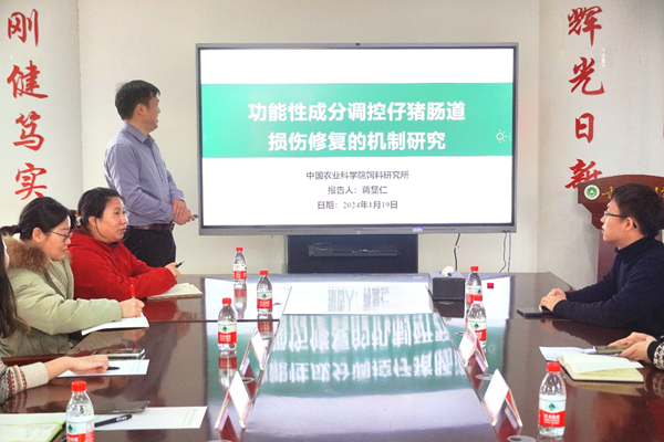 报告之后,黄网师生与蒋老师进行了学术讨论,受益匪浅。最后,蒋瑞瑞教授对研究员蒋显仁带来的精彩报告表示衷心感谢。此次学术交流为有效缓解仔猪断奶应激引发肠道损伤,实现减抗限锌提供了新思路,有效助力我国生猪产业高质量发展,也为加强双方未来深入合作奠定了良好的基础。