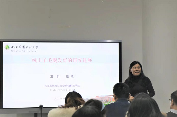 王昕教授以《绒山羊毛囊发育的研究进展》为题,通过简单介绍陕北白绒山羊,深入讲解了绒山羊毛囊发生发育中lncRNA的筛选与鉴定、绒山羊毛囊发生过程单细胞转录图谱的构建、褪黑素影响绒山羊HFSCs增殖与分化、绒山羊毛囊发生发育关键信号通路和基因的筛选和鉴定、Hoxc13对毛发角蛋白的调控及其自身的调控机制、DNA甲基化对绒山羊毛囊分化的调控六项研究结果,为黄网师生在遗传育种方向的研究带来了新的思路。