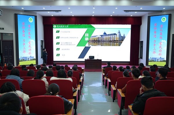 王成章以《开启新征程 走好大学路》为题,以个人人生经历为引,分别从什么改变了我们的生活、关于动物科学及相关专业的就业去向、成功的要素等三个方面进行分享。通过列举商界精英秦英林,科教英才康相涛等杰出专业人才向同学们展示了动科专业就业方向,又从转行就业和素质教育两方面介绍了专业转行的可探路径。