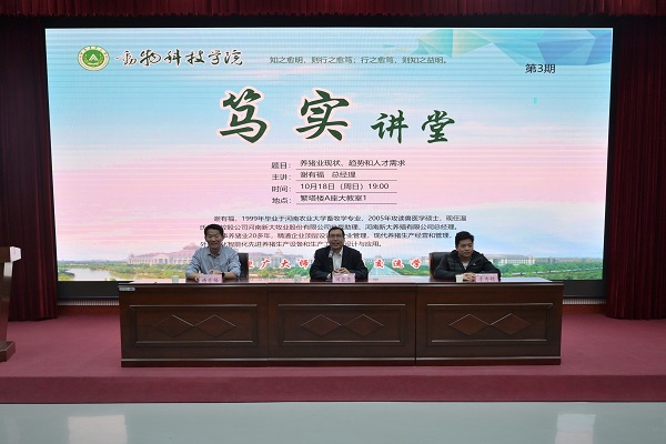 本网讯(通讯员 程浩师)10月18日晚,黄网在教学楼大教室一举办第三期笃实讲堂,邀请温氏集团控股有限公司河南新大牧业股份有限公司总裁助理、河南新大养殖有限公司总经理谢有福为主讲嘉宾,副院长田亚东、辅导员李秀领老师、2020级全体新生和部分2019级学生参加活动,讲堂由田亚东主持。